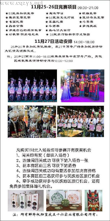 据介绍,本次活动以56个民族为元素,围绕传播56个民族喜庆文化,提升重庆人幸福指数的理念,聚焦各民族的婚俗、节庆、乐器、舞蹈、音乐、服饰、茶、酒、食品、特色美食等丰富多彩的文化元素。同时,将以‘体验舌尖上的民族美食’、‘指尖上的民族工艺’、‘心尖上的民族印象’三大主题推出12个专题系列活动,让重庆市民在吃喝玩乐行购游活动中体验民族文化。