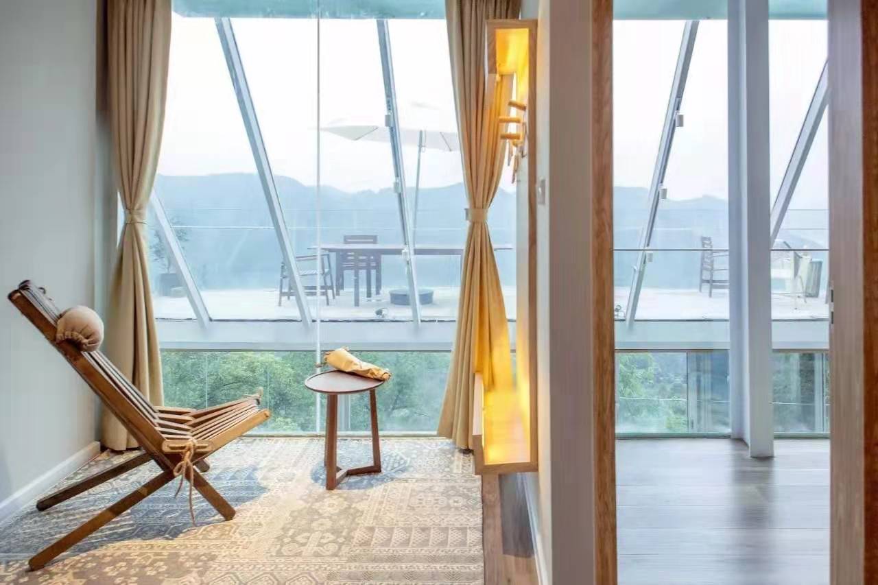 山鬼位于重庆南岸区南山公园北路24号,是一家全玻璃打造的特色民宿,在南山山顶,环境清幽,可谓一览众山小。山鬼的名字源自屈原的《九歌》,共有五层,6间客房。一层开设“有食”私房餐厅,第二三层便是六间客房,客房的名字也取自屈原的《山鬼》,分别为:山之阿、辛夷、子慕、含睇、杜衡和遗所思。翻译为:在山林深处有香草和树木,还有爱慕的人含情而视,赠与你所思所想。像极了在山鬼,在南山上美景中,与心上人约会,以及再次等待心上人的故事。