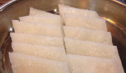 蒸盒内填满米粉、压平,上面再加上点白糖、红糖、洗沙或汤圆心子、一小坨猪油。蒸上几分钟后,如马蹄状,色泽油亮洁白,刚好一口的大小。