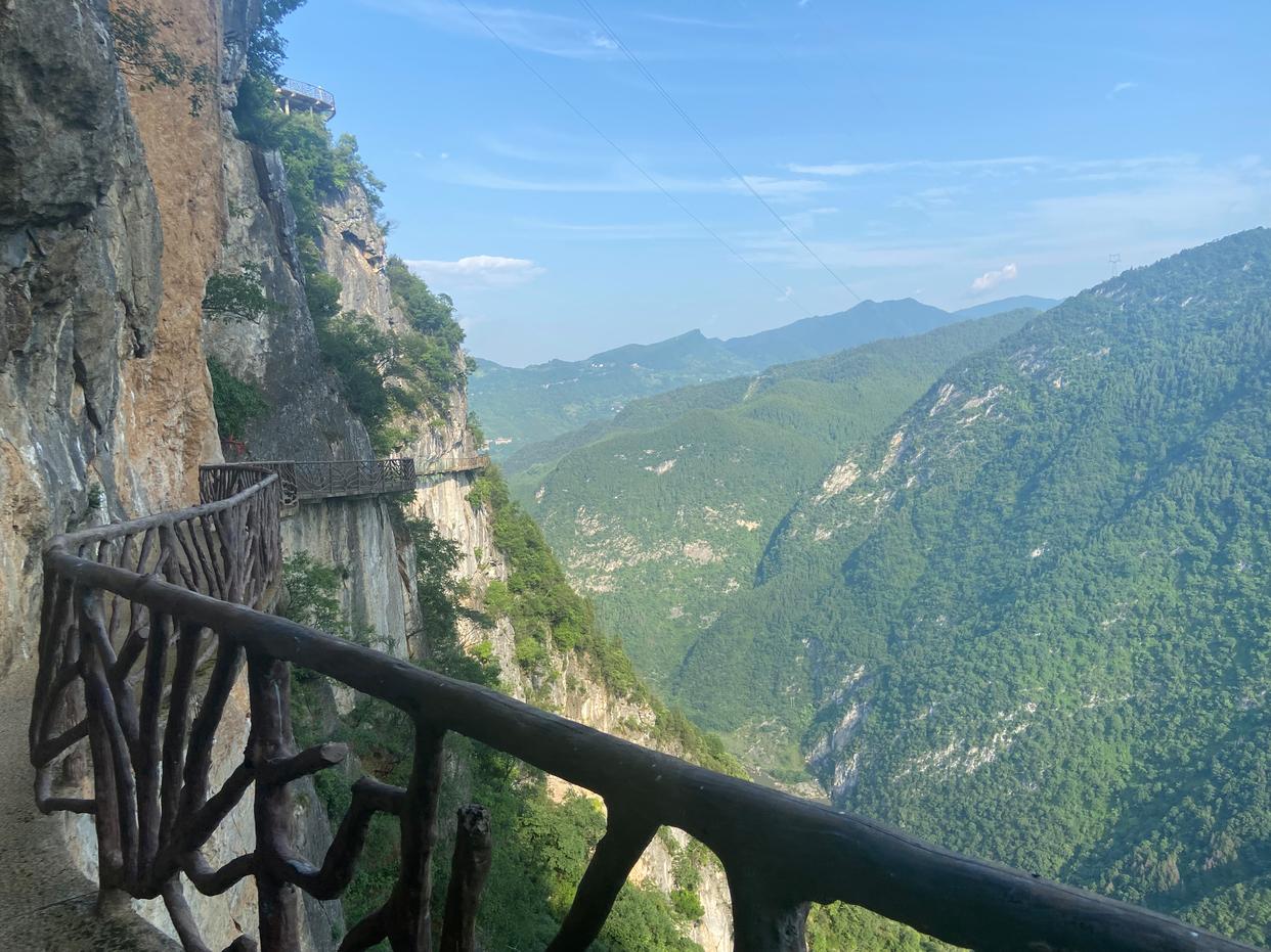 连天栈道:3.5公里绝壁玻璃栈道悬于龙河谷900米高空,5D特效段模拟“玻璃碎裂”,俯瞰深谷如微缩盆景。