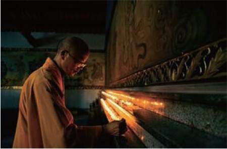从广场牌坊拾阶进入佛家世界,高16米的金身释迦牟尼大佛端坐在莲花台上,壮观的气象让人肃穆。点枝清香,祈求来年心想事成。