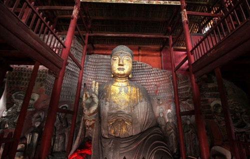 据涞滩“旅游指南”介绍:二佛古寺始建于唐,兴盛于宋,分上下两殿。主像释迦牟尼佛神态慈祥,衣纹流畅,通高12.50米,不仅为全寺造像之冠,而且也是四川有名的大佛之一,据寺内明代正德十三年《重建轻峰禅寺记》碑记载:“全蜀大佛有三,而宕渠深滩镇日鹫峰盖其二佛也”,说明该佛为当时蜀中第二大佛,二佛寺也因此而得名。