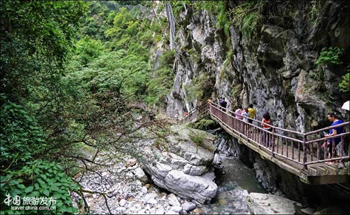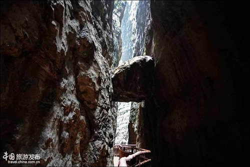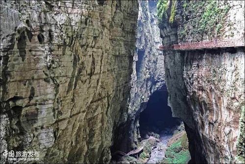 再往前,便来到了景区的核心地带--青天峡,位于景区峡谷下段,全长1500米长,峡谷宽度2-5米,被称为天然地缝。峡谷两边悬崖峭壁高度在200-300米 ,抬头仅见天光一线。地缝中怪石林立,钟乳石千姿百态。沿着蜿蜒的栈道走在其间,幽谧古奇之感顿生,壁峭崖有的地方仅隔数尺,而悬在头顶的巨石更是令人震撼。 建在崖壁的的栈道也成为一道景致,如缠在崖壁的腰带或巨蟒,空旷幽谷中声音回荡,寻觅丝丝关于巴人的遗迹,只是他们早已穿越这时空之谷消失在了时间的洪流尽头。
