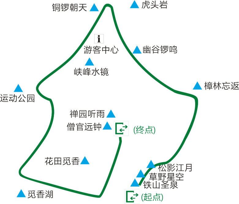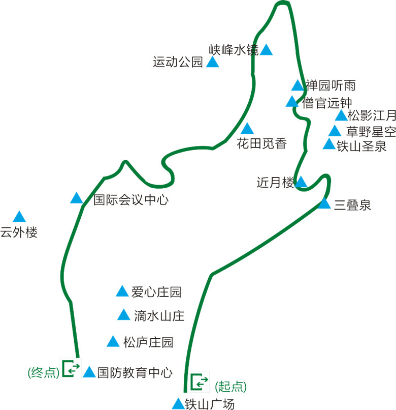 从铁山广场出发,经峡峰路观赏铁山十景,最后取道云岭路、松缘路到达国防教育中心。游客可采取自行车骑行或自驾游览,尽享登山乐趣,观赏铁山松涛、空谷鸟语的悠然美景。