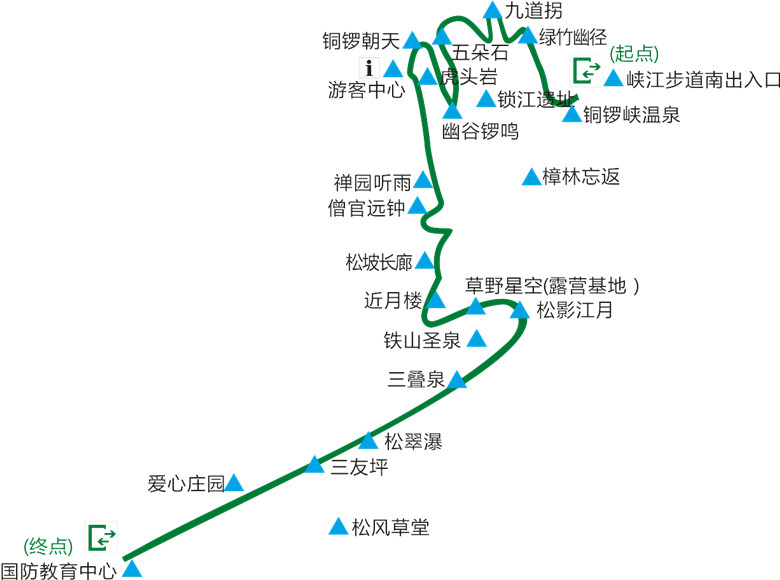 从峡江步道南入口出发,沿途经过虎头岩、锁江遗址等遗址故地,最终到达国防教育中心。全线“以诗文入风景借观景思古今”,集中呈现了铁山坪“峡江、佛禅、仁爱”三大人文主题。