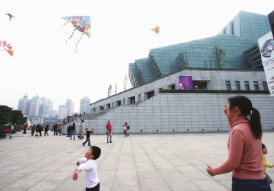 中央公园地处寸土寸金的江北嘴中央商务区,是主城区最精致的一块“碧玉”。中轴线中段有一条与之交叉的横向步道,叫做桂花街。街上两座风格各异的教堂相映成趣,前面一座浅色的天主教堂名为福音堂,后面一座深灰色的基督教堂叫德肋撒堂。多年前,两座教堂曾是老江北城的亮点,这次它们在中央公园内得到“重生”。人们除了可以到大剧院看两江,还可以在公园内开阔的草坪上晒太阳、放风筝,在园内及周边骑自行车。在这种环境里放风筝,心情不舒畅都难。